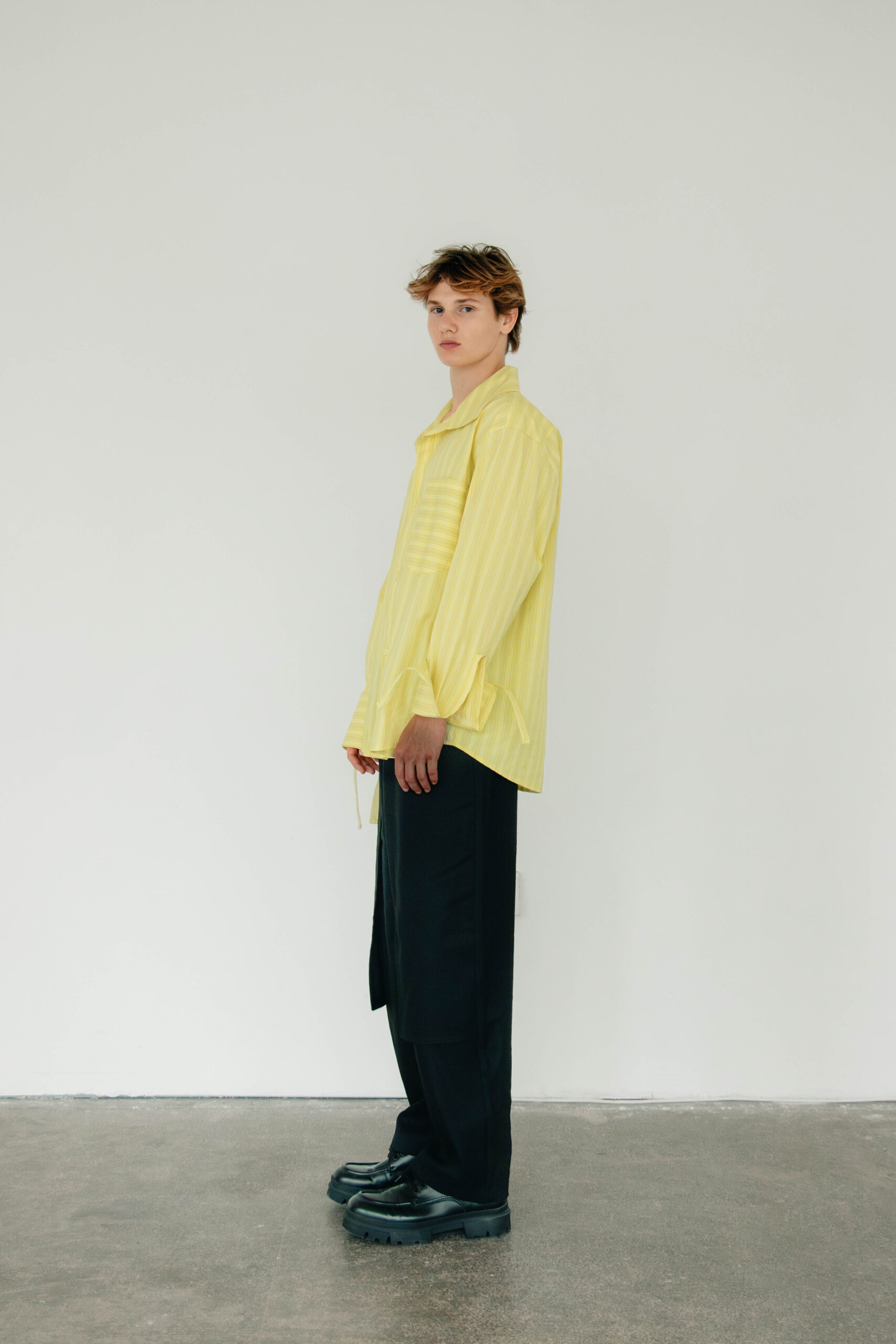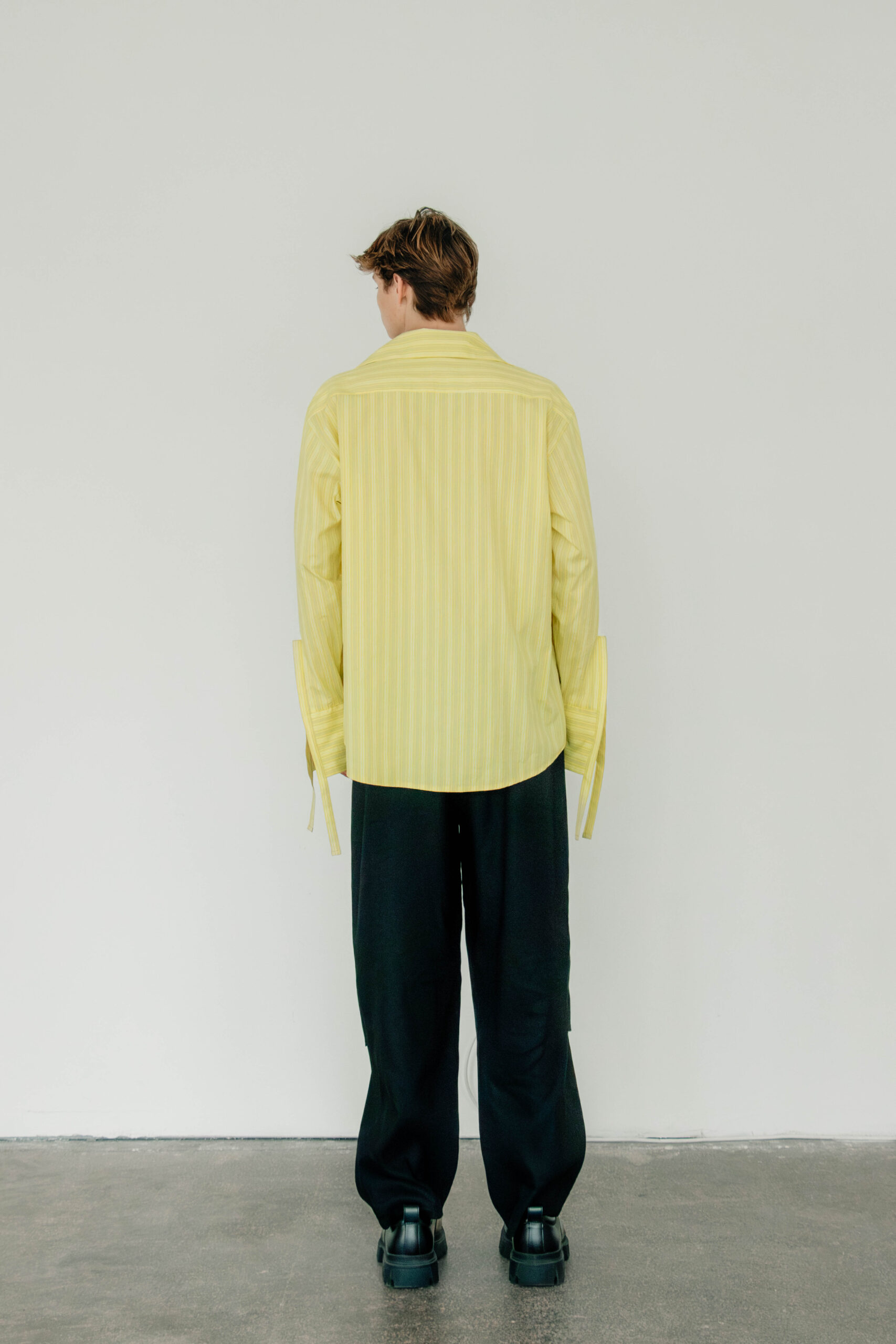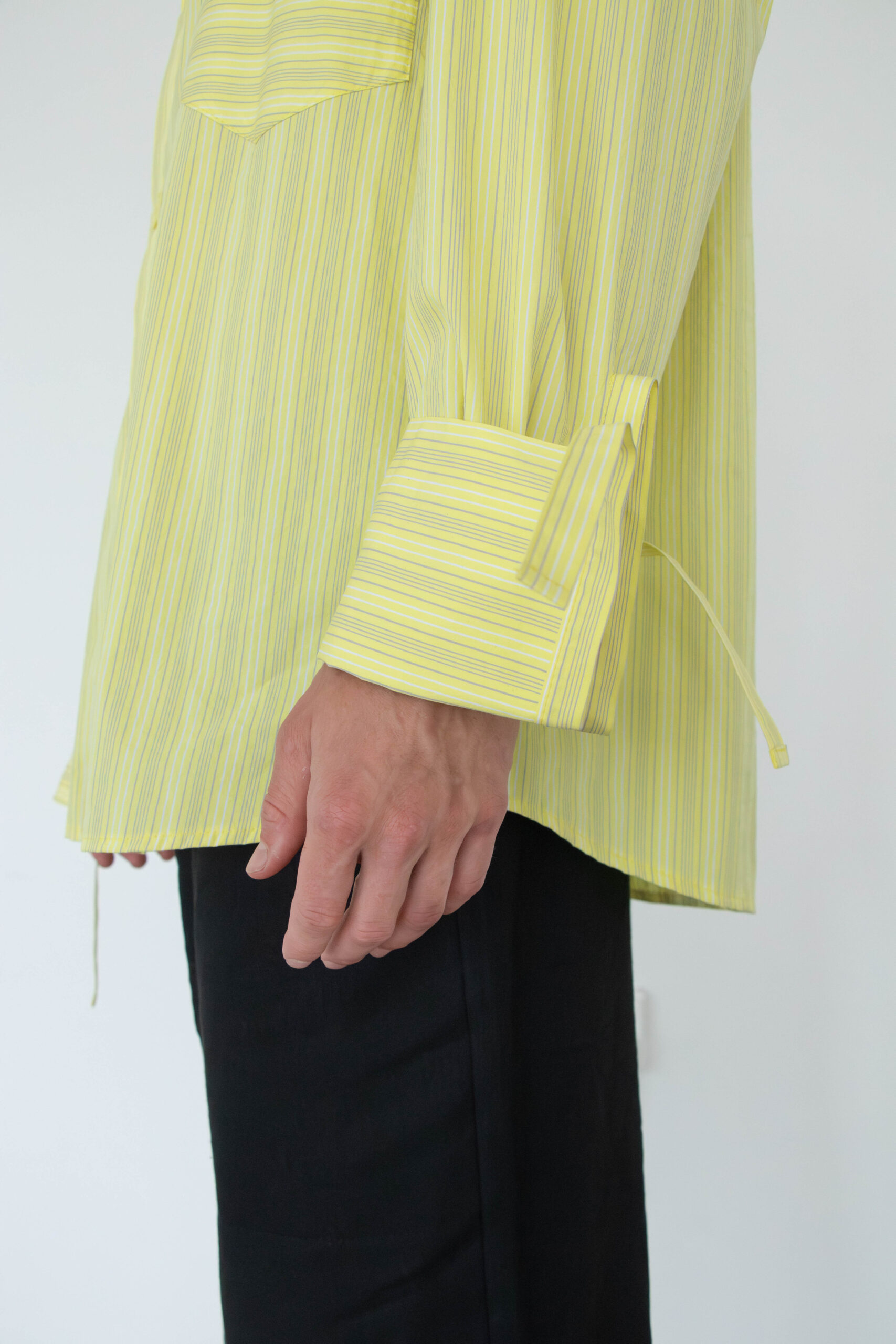 A refined take on a classic silhouette, crafted from lightweight yellow cotton fabric with a subtle stripes. Features dropped shoulders, one front pocket, deconstructed details on both cuffs and a boxy, oversized fit. Finished with plastic buttons for a clean, modern look.